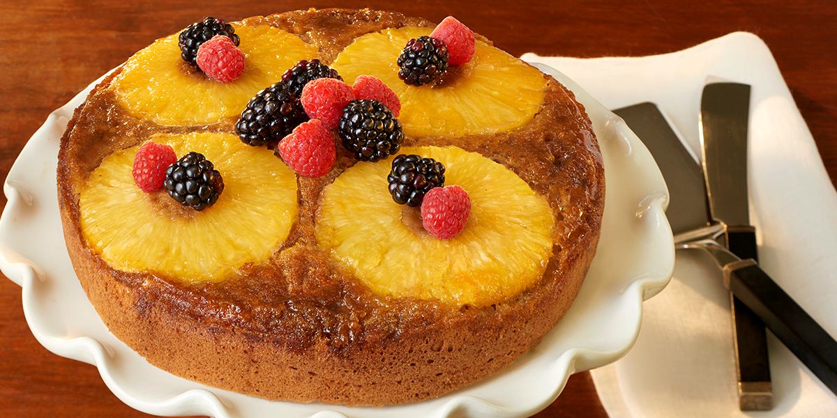 - Faire cuire 45 minutes ou jusqu'à ce qu'un cure-dent inséré au centre en ressorte propre. Retirer du four et laisser refroidir pendant 20 minutes avant de retourner le gâteau sur une assiette de service. Retirer le papier parchemin. Placer plusieurs baies au centre de chaque ananas. Laisser refroidir complètement avant de servir.