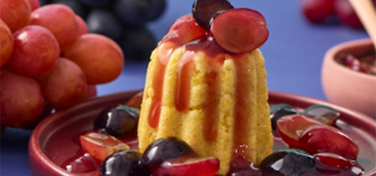 Togli i dessert dagli stampi, disponili sui piattini da portata e servi con la composta d’uva.