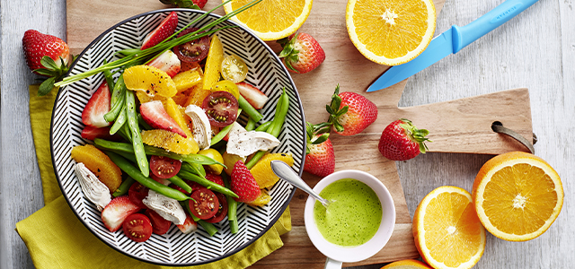 Sciacqua i fagiolini e cuocili in acqua bollente per 6-8 minuti. Una volta scolati, raffreddali con acqua corrente. Lava e taglia a metà i pomodorini, sbuccia le arance e dividile a spicchi. Ricordati di rimuovere le pellicine bianche, per evitare che diano un sapore amaro al piatto. Lava le fragole e tagliale in quattro parti.