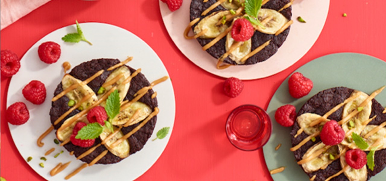 Per finire, scalda il restante burro di arachidi con 2 cucchiai di acqua e 1 cucchiaio di sciroppo d'acero così da ottenere una crema; versala in una sac à poche e decora i brownies. Aggiungi qualche lampone, i pistacchi tritati e le foglie di melissa.