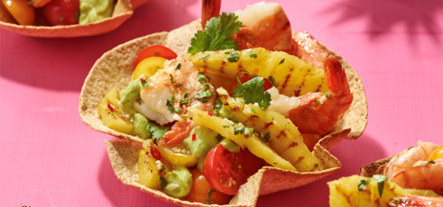 ¡Hola! Ecco la nostra Tortilla Bowl con ananas, crema di avocado, pomodorini e gamberetti, che porterà la gioia di vivere messicana direttamente a casa tua! Attireranno l’attenzione di tutti e faranno venire l’acquolina in bocca solo a guardarle. Il tocco intenso dei peperoncini piccanti e del coriandolo, conferiranno alla ricetta un sapore unico. Tutto da scoprire!