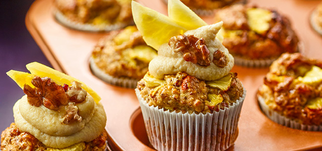 - Laat de muffins afkoelen. Doe de cashewnotencrème in de spuitzak en verdeel de crème over de muffins. Garneer met de overgebleven ananasschijven en de walnoten.