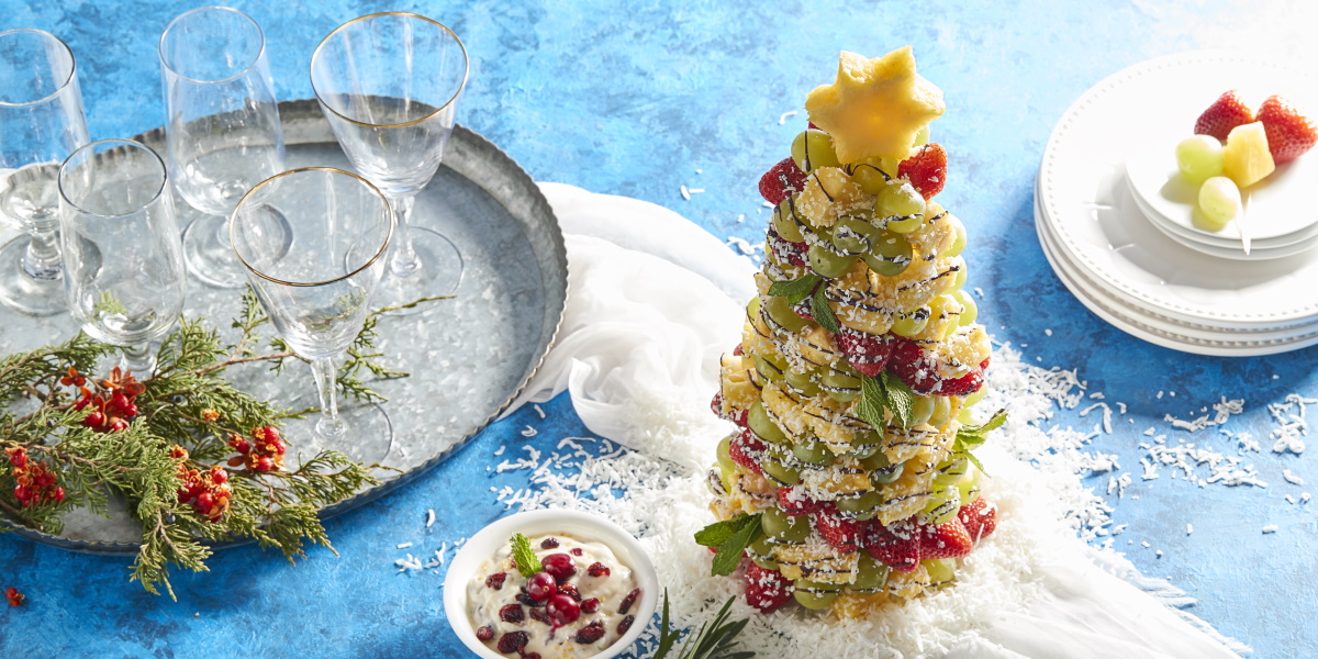 - Wrap cone in aluminum foil. Cut a star from pineapple cross section using a 3-inch star-shaped cookie cutter; thread star onto skewer. Insert toothpicks into cone to create “Christmas tree branches”; carefully thread grapes, strawberries and pineapple pieces onto toothpick “branches.” Insert pineapple star into top of “tree”; serve with Cranberry-Ginger Dip and additional toothpicks.