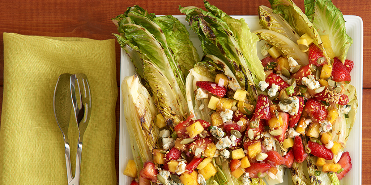 - Arrange romaine on serving platter, cut side up. Spoon balsamic strawberries-pineapple glaze over romaine and sprinkle with blue cheese, pumpkin seeds and flaxseeds.