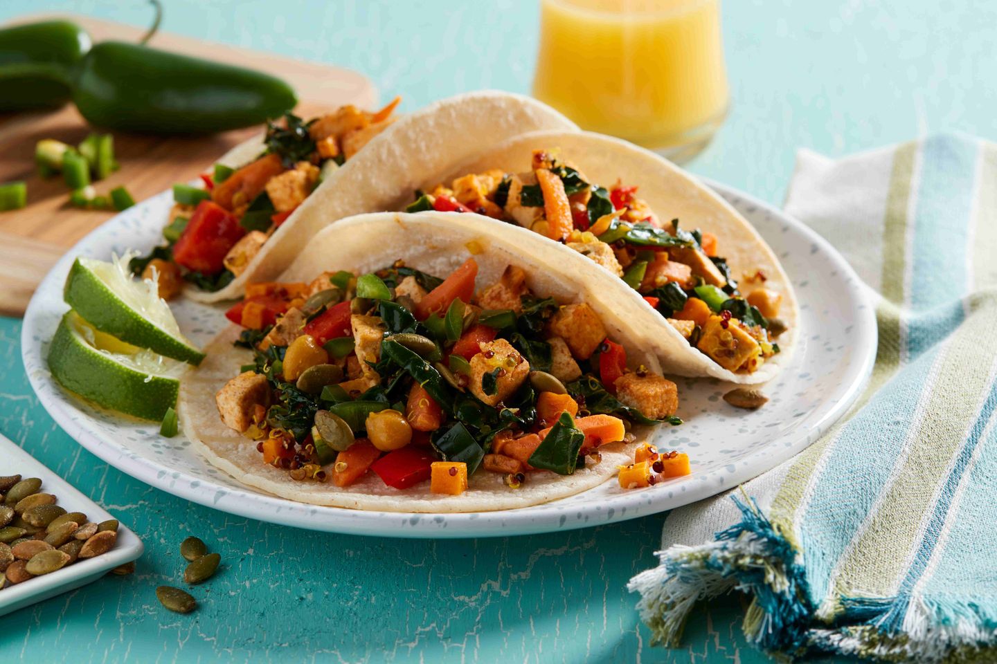 - Stack tortillas on microwave-safe plate between 2 damp paper towels; heat in microwave oven on high 30 seconds or until warm. Fill tortillas with sweet potato mixture; top with jalapeño and pepitas. Serve with lime wedges and additional hot sauce.