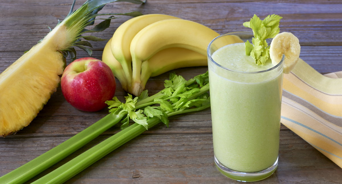 - Combine celery, banana, pineapple, apple, coconut water, ice and honey in blender or food processor. Cover; blend until smooth. Garnish with banana slice and celery leaves, if desired.