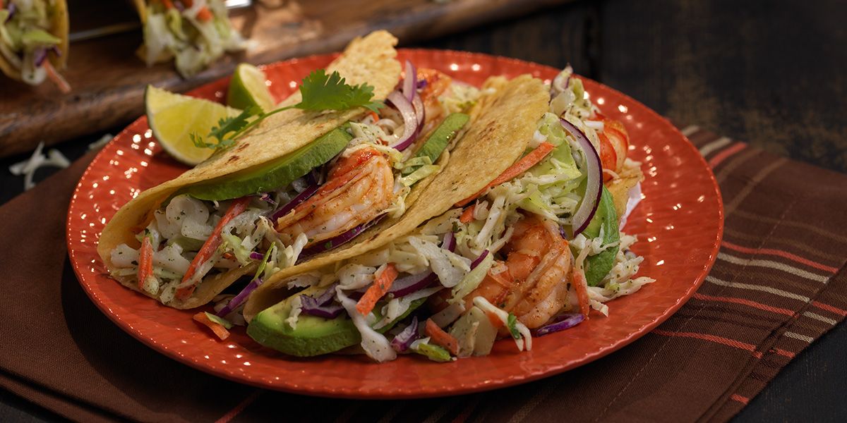 - Stack tortillas, on microwave-safe plate, between 2 damp paper towels; heat in microwave oven on high 30 seconds or until warm. Fill tortillas with shrimp, slaw, avocado and red onion; stir yogurt and drizzle over tacos. Serve with lime wedges, if desired.