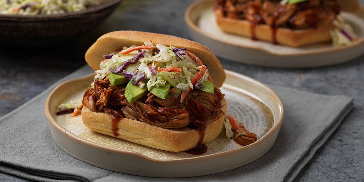 - Serve chicken mixture in buns topped with avocado and slaw.