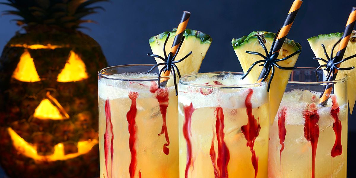 - Fill six tall glasses with ice cubes. Divide pineapple mixture between glasses, about 2/3 cup in each. Pour in 2/3 cup seltzer and stir. Dot some Cranberry “Blood” in several spots along inner edge of the glasses, making sure “blood” touches glass. The “blood” will swirl as it falls to the bottom of the glass!