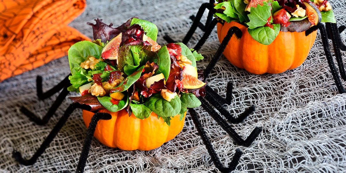 - Toss spring mix with half the dressing and all of the figs and pear chunks. Fill pumpkins with approximately 3/4 cup salad. Drizzle the salad with additional dressing and sprinkle with walnuts.