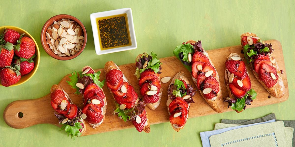 - Spread ricotta mixture over toasted baguette slices and shingle sliced strawberries on top.