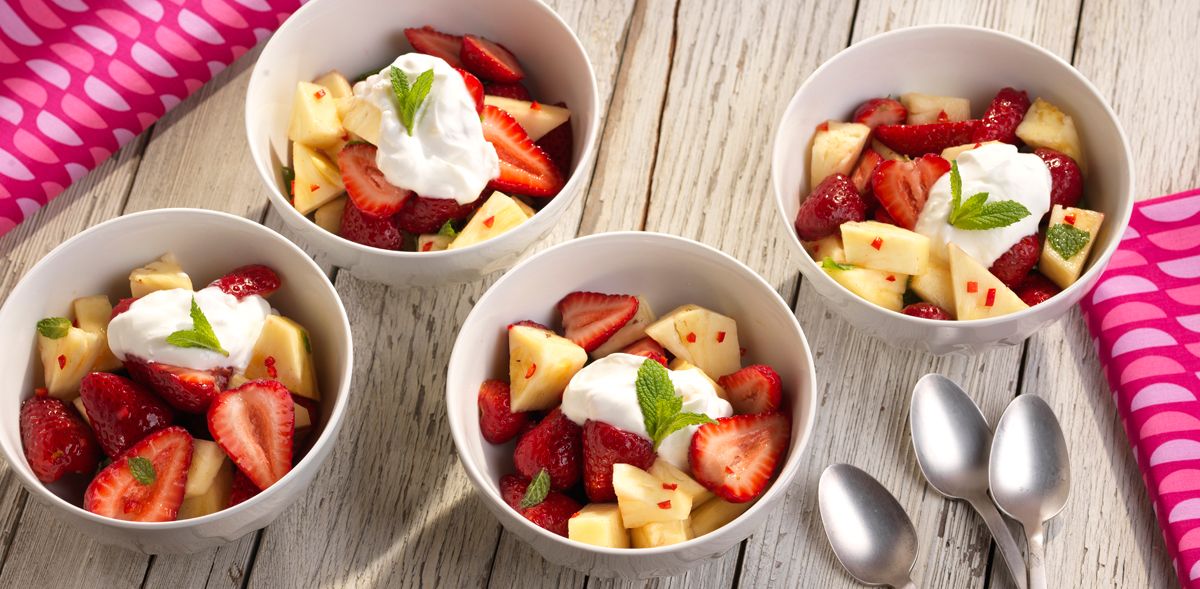 - Strain chili mixture over the fruit. Sprinkle remaining chopped chili, and gently toss to coat. Divide salad between four bowls and top with yogurt.